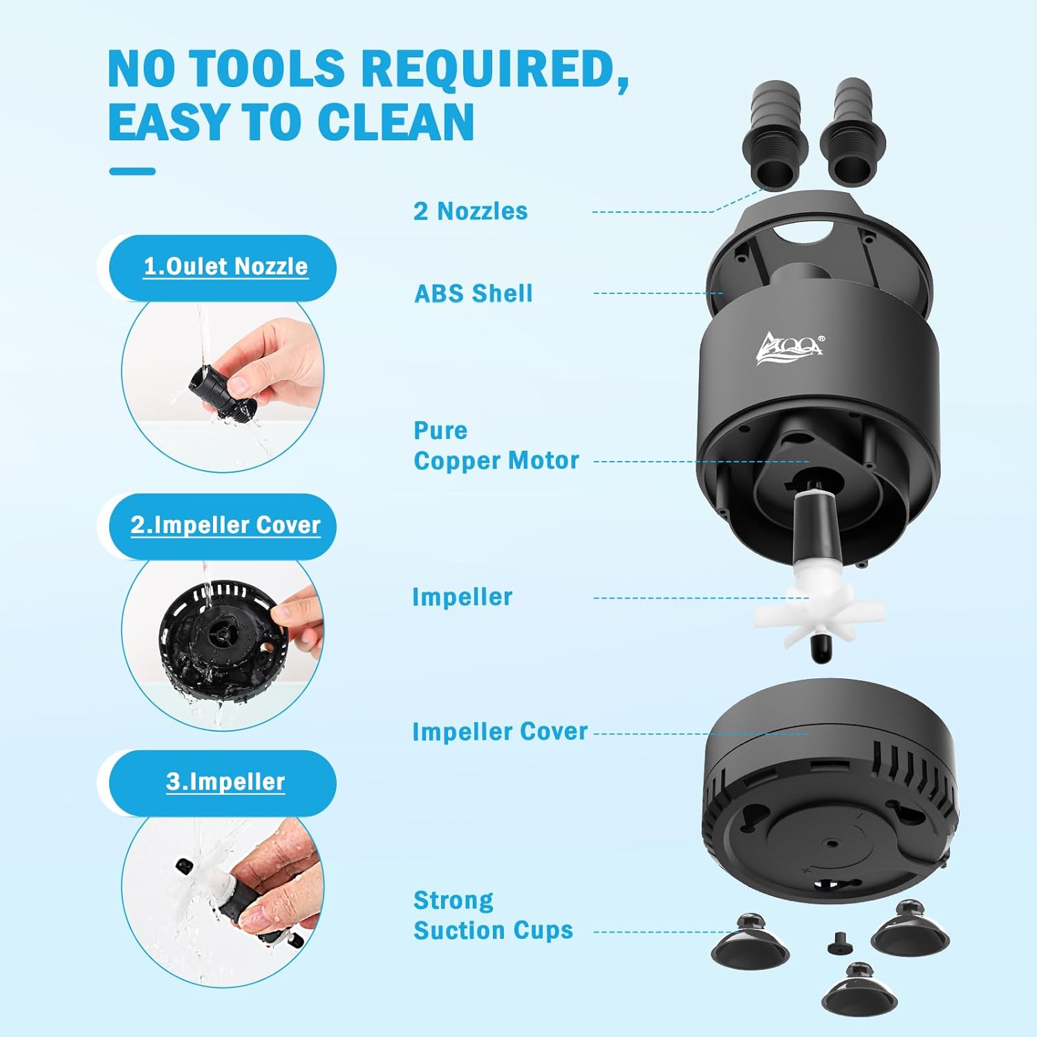 - Designed with a low water level and all-around suction at the bottom, this pump can quickly remove dirt and impurities from your aquarium.Pump water as low as 1cm.Compact Water pump is easy to hide or disguise,doesn't need any tools to disassemble it and is easy to be cleaned.