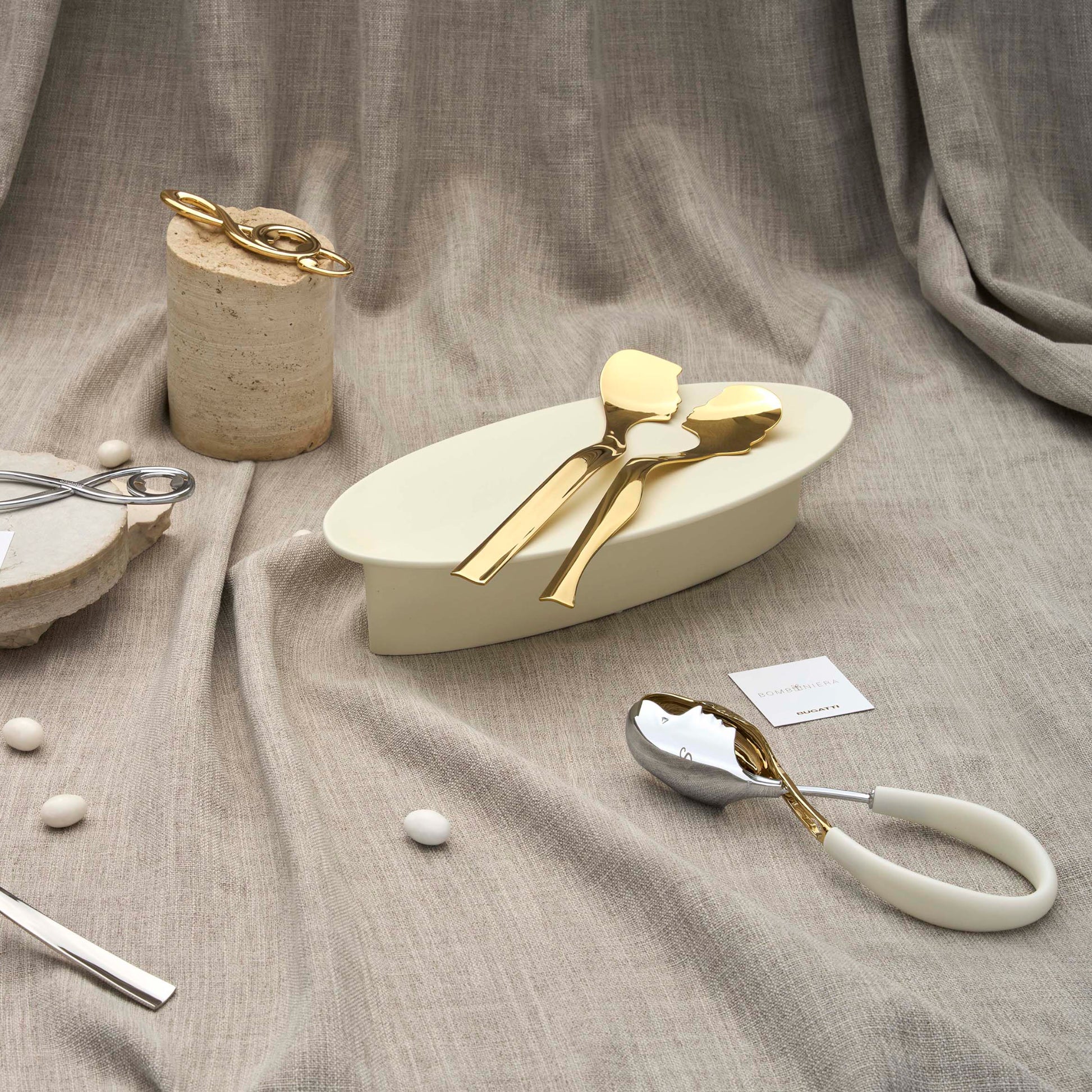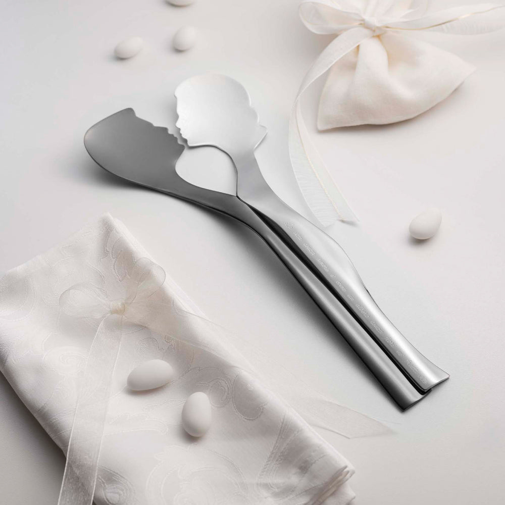 A hug is when the heartbeat of two becomes one, fixing that magical moment into eternity. With the new Abbraccio salad cutlery set we want to celebrate all the emotions that are released in that moment. A favor designed to amaze, an elegant and unexpected gift idea. Cutlery made of 18/10 stainless steel and is available in different combinations. The set is customizable to make your gift even more special.