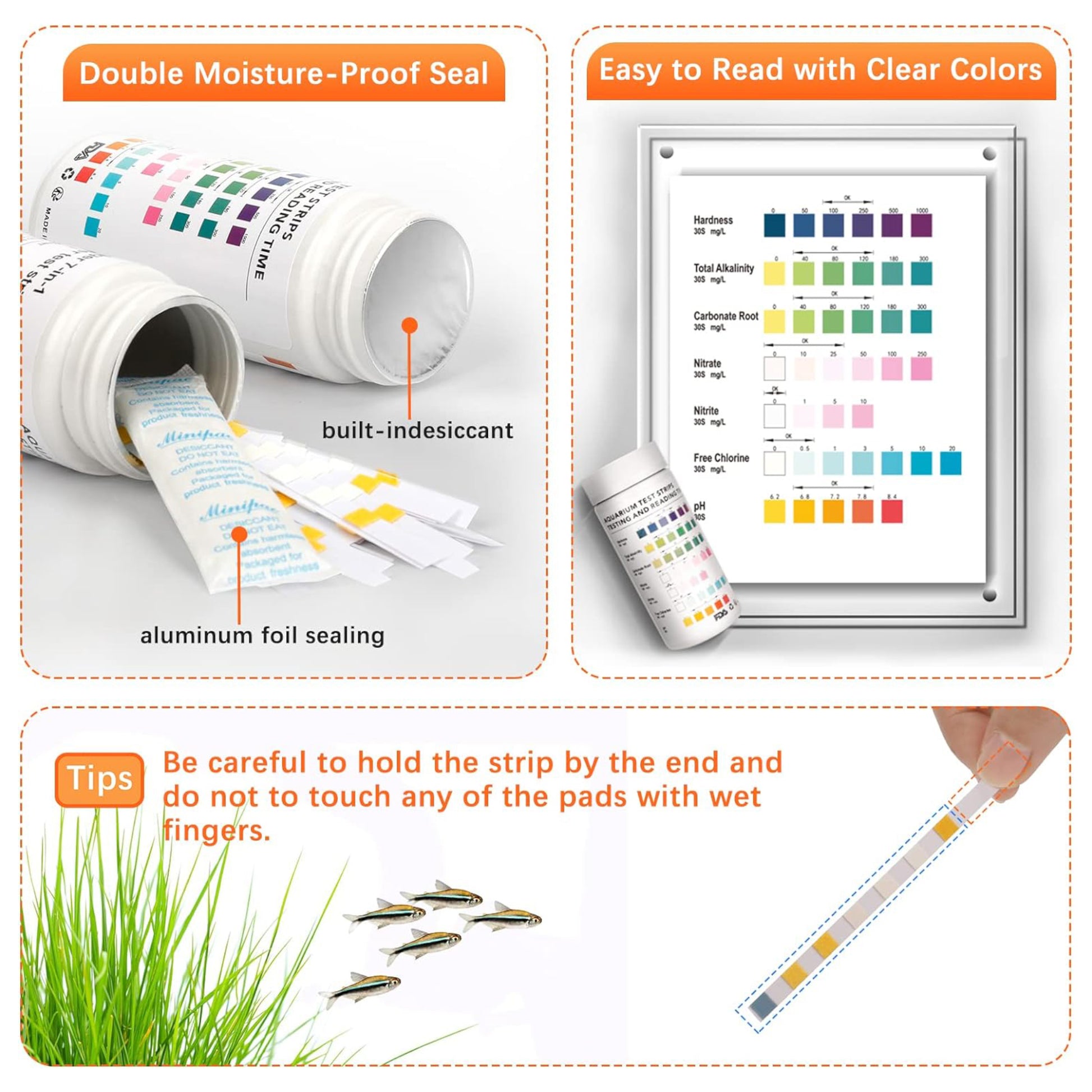 - Includes monitoring the water chemistry of hardness, the water test strips monitor the water quality parameters changes in water PH, total alkalinity, carbonate root, nitrate, nitrite, and free chlorine level so you can get a better idea to build your tank ecosystem