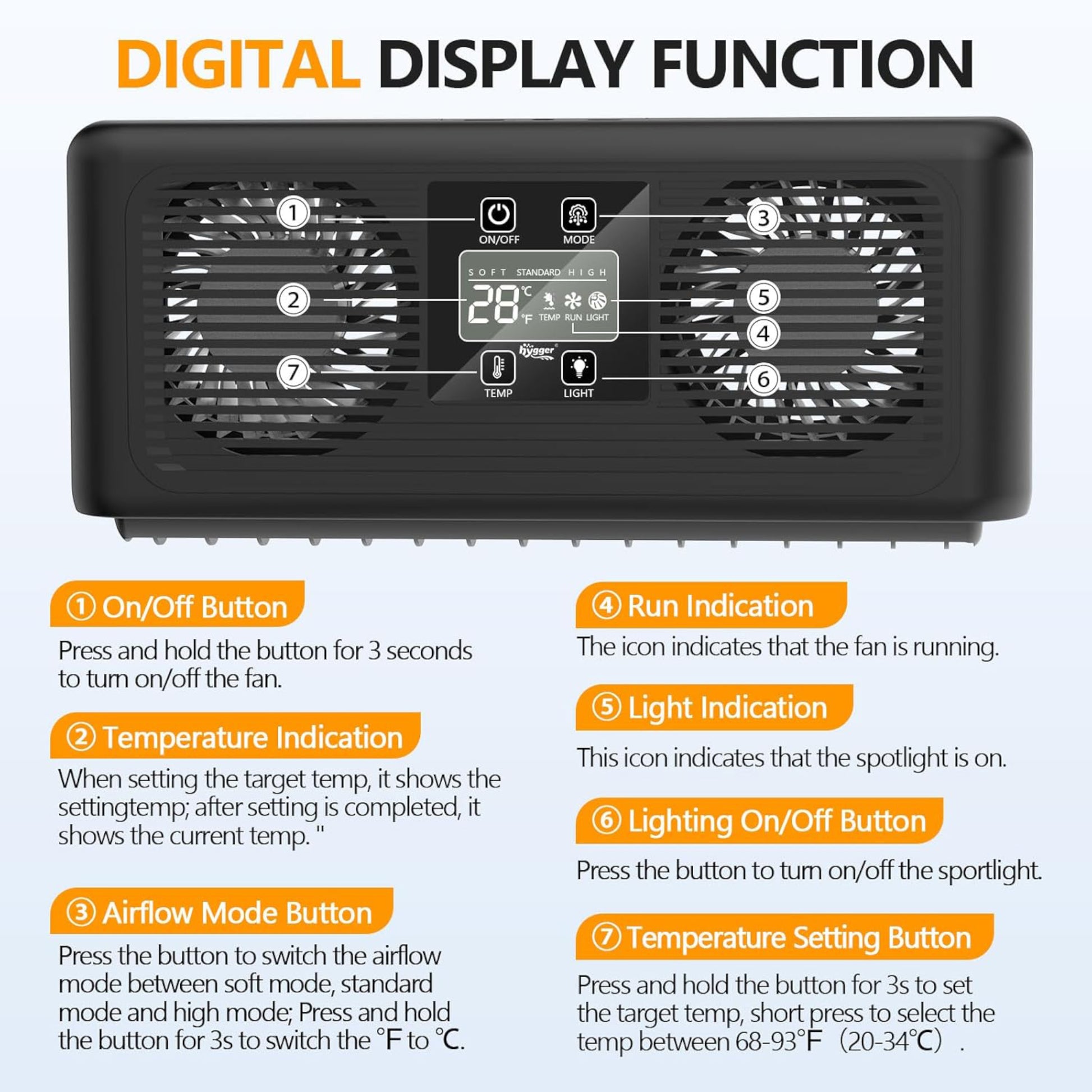 - Intelligent Automatic Start and Stop: 3-level wind speed adjustment, 68-93℉ adjustable temperature range, you can choose the appropriate wind speed and target temperature according to your needs, very convenient! The temperature probe continuously monitors the aquarium temperature and automatically starts and stops to maintain the target temperature. The digital display shows the water temperature, fan speed level and operating mode in real time. Whether it is day or night, just set it and leave it, the aquarium fan will ensure precise control and provide the right water temperature for your beloved fish