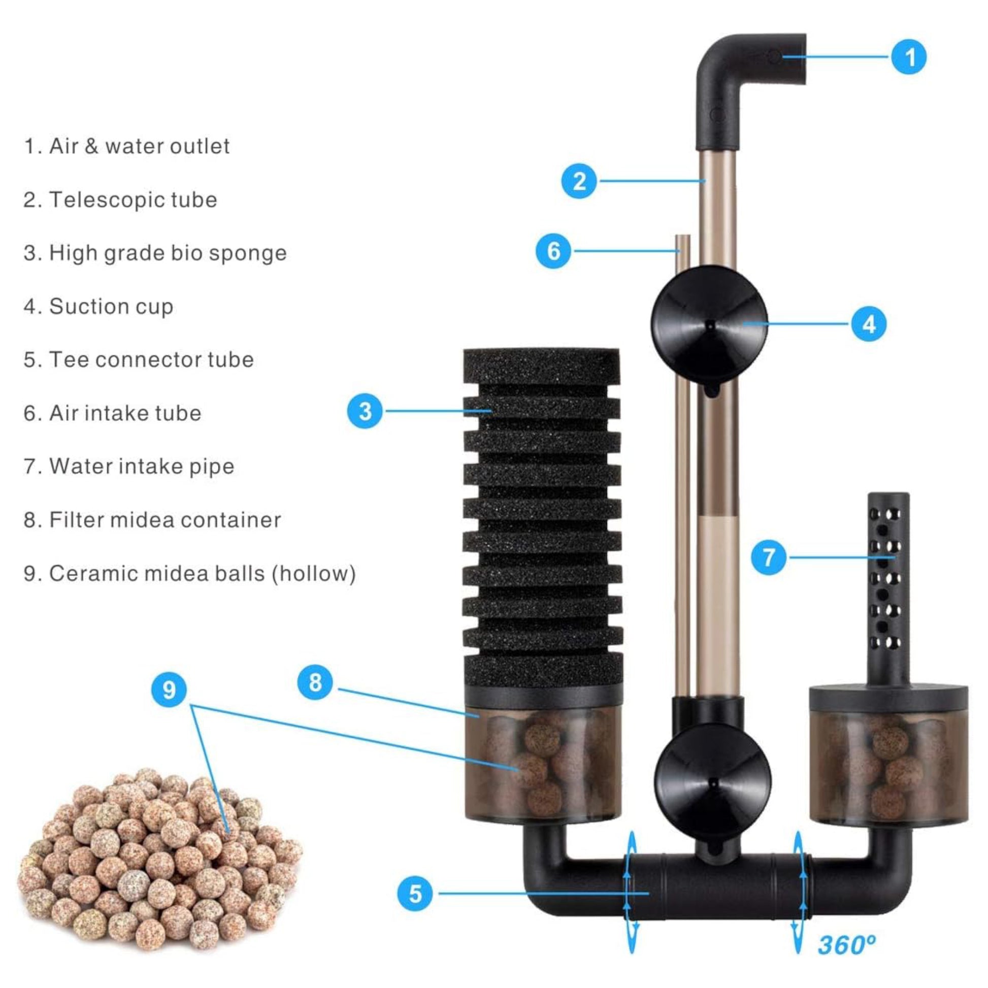 - Included: 1x Retractable Outlet Pipe with Air Tube Connection, 1x Double Sponge Filter with Media Container, 1x Ceramic Pearls, 2x Suction Cup, 2x Sponge Replacement (In ceramic pearls container), 1x User Manual