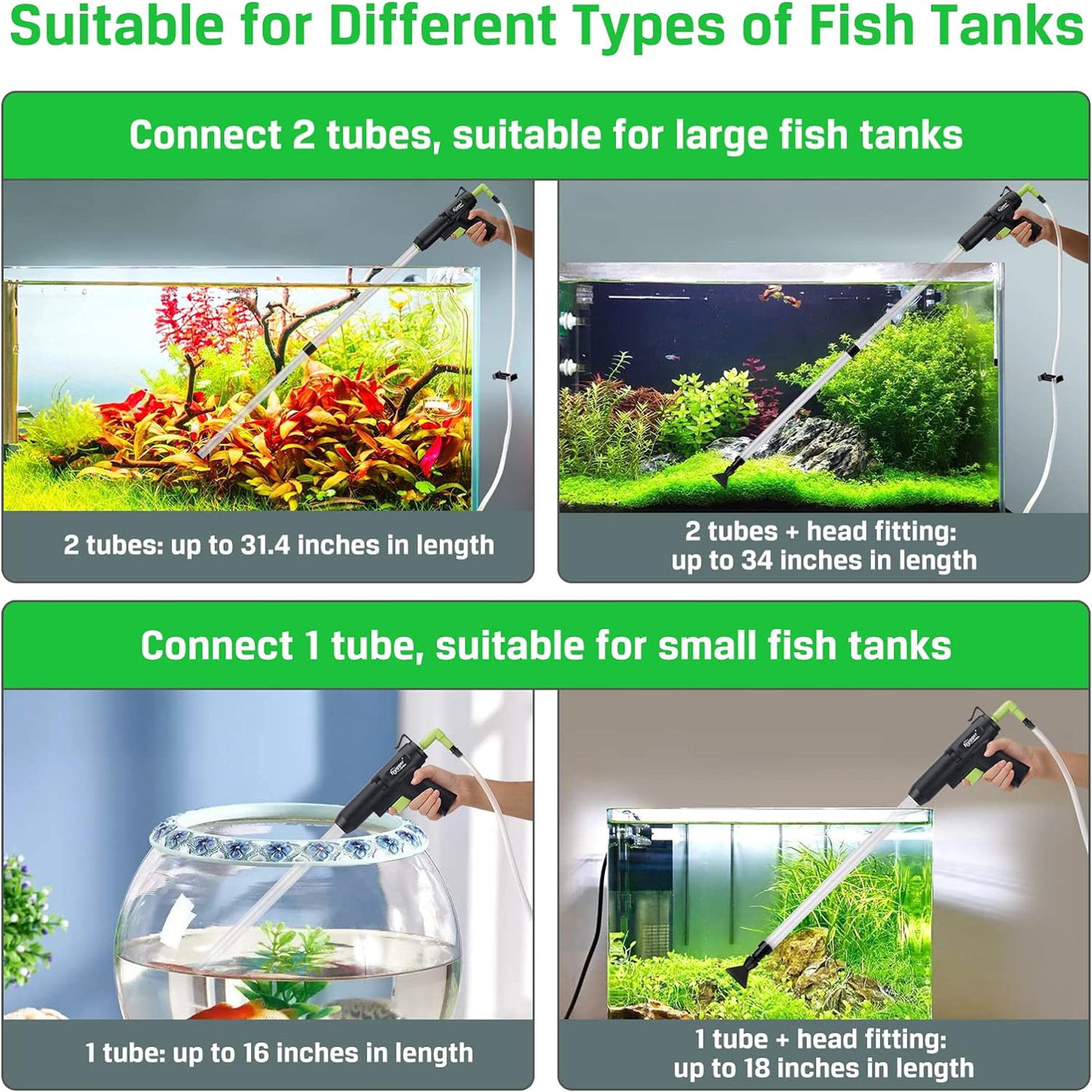- Wide application: The aquarium cleaner is suitable for different types of fish tanks. You can free to choose according to your needs from six combinations: 1. Handle + 1 tube (16in) 2. Handle + 1 tube + duckbill head (18in) 3. Handle + 1 tube + brush head (18in) 4. Handle + 2 tubes (31.4in) 5. Handle + 2 tubes+ duckbill head (34in) 6. Handle + 2 tubes + brush head (34in)