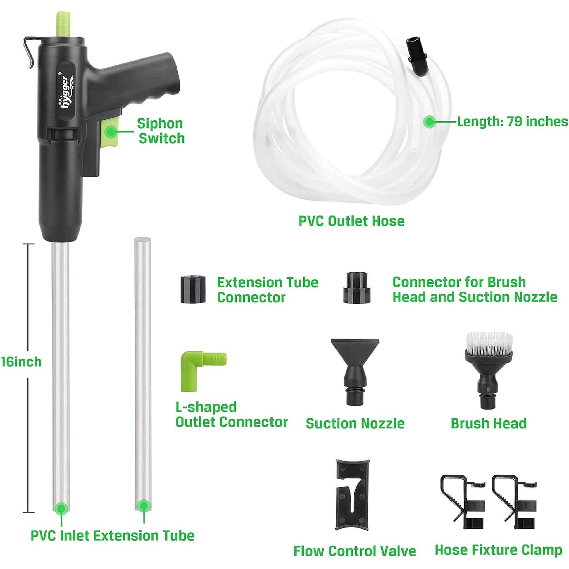 - Water changer: You can easily change the water with a 79-inch high-quality long silicone hose, a flow control valve, and two hose fixture clamps. Adjust the flow of water with the control valve. A hose fixture clamp can secure the hose and free your hands