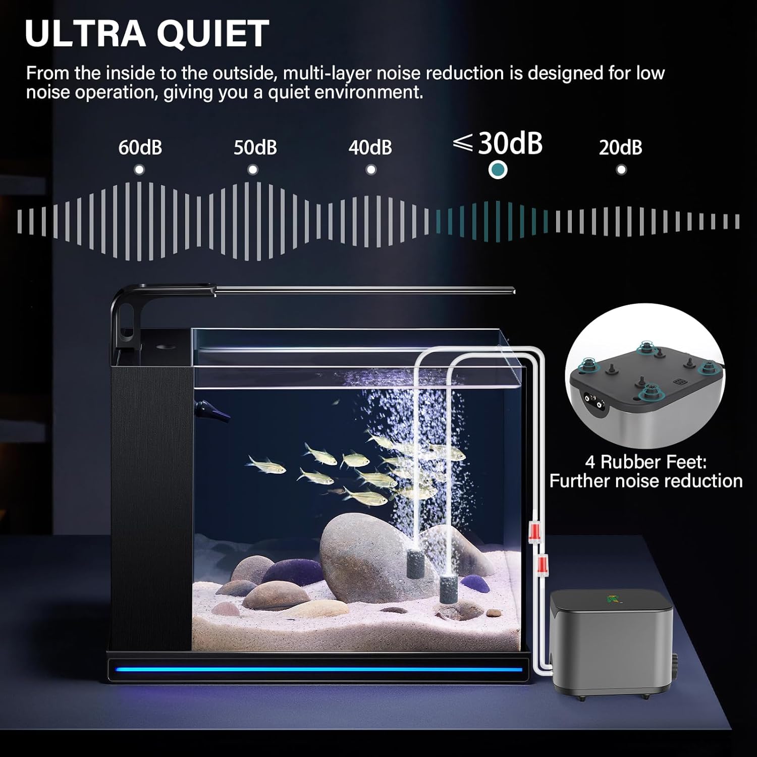 - The air pump is designed with inner and external dual thickened shell, double-layer sound absorption, suspension motor and 4 soft silicone feet, anti-vibration and noise reduction, to achieve low noise operation, and the max noise does not exceed 30dB, super quiet.