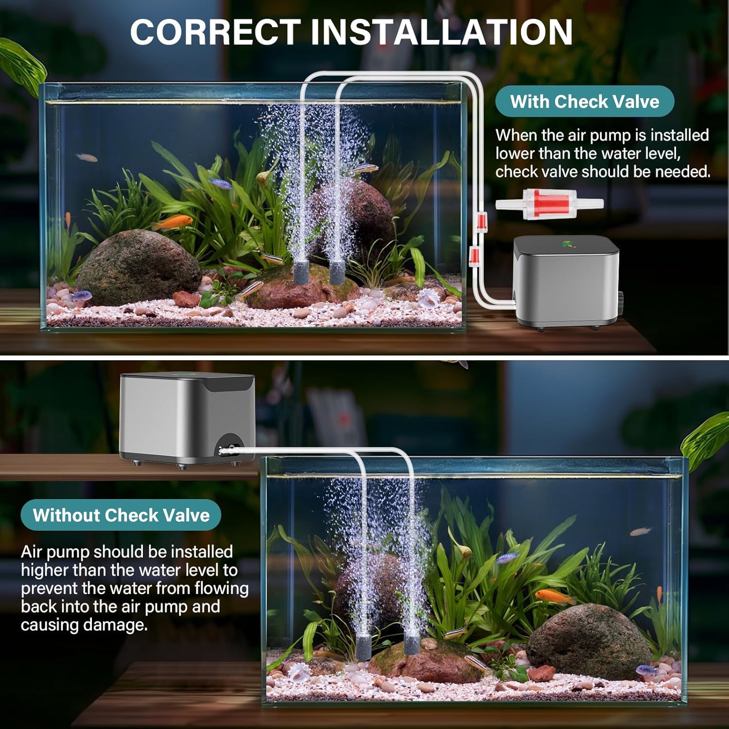- Dual air outlets are made of stainless steel, very durable, and output airflow is stable, that make fish air pump can supply oxygen for 2 fish tanks at the same time. Aquarium air pump can also drive different products at the same time, like nano air stones, sponge filters and aerobic landscape equipment in aquariums