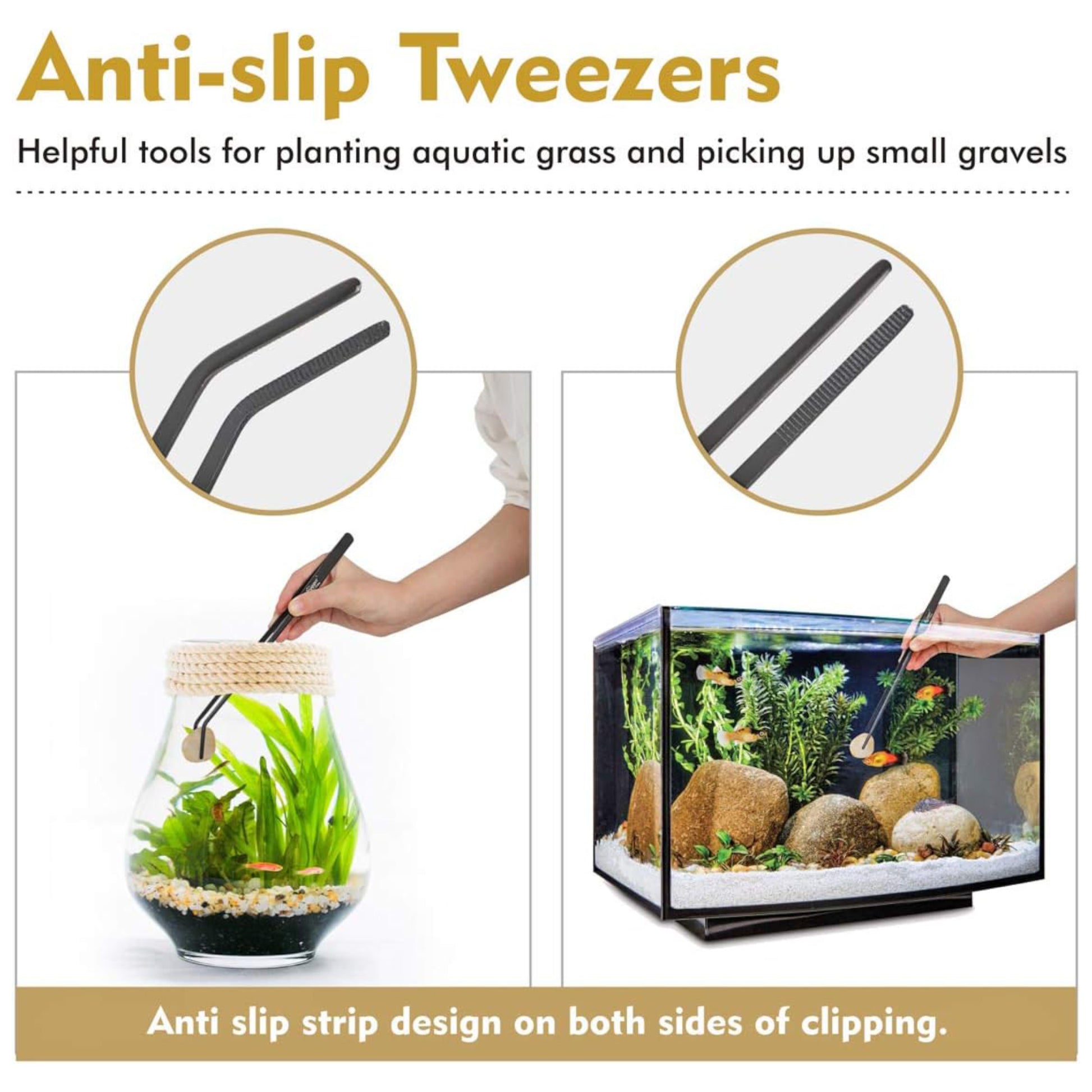 Made of quality stainless steel, it’s sturdy, good grip, and no rusting. The aquatic plant tools are black which looks cool and premium. Black paint was sprayed on the whole tool to prevent the metal tools from getting rusting.