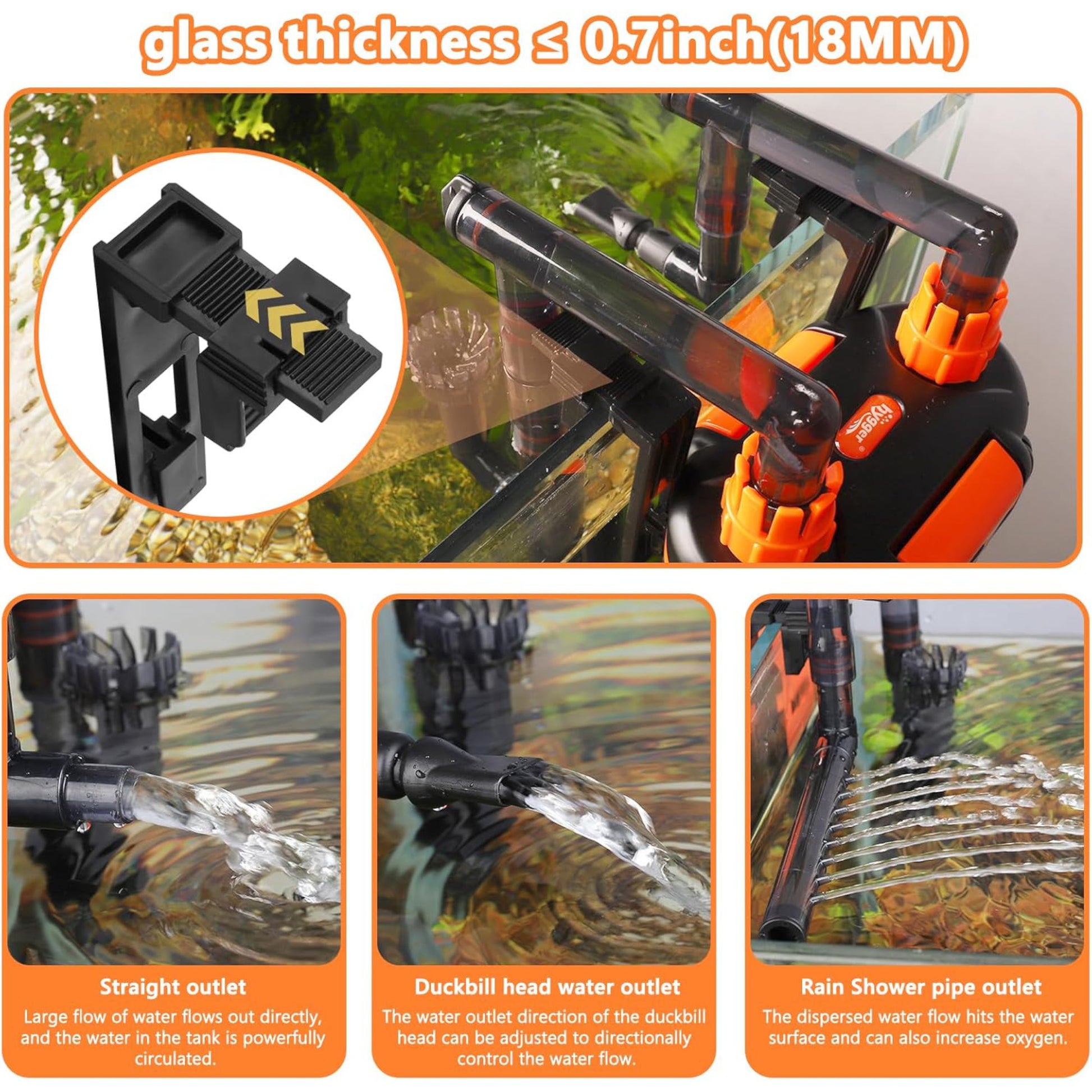 - Easy to use: The entire filter body is not placed in the tank and does not occupy the space of the aquariums, only one water inlet pipe is in the tank. It is suitable for small space tanks, landscaping tanks with aquatic plants and stones, or with fish that are afraid of the sound of motors. It can hang on the tanks, and the fixing clamp can be adjusted, it is suitable for tank glass thickness ≤ 0.7 inch (18mm), and can also be placed next to the fish tank without hanging.