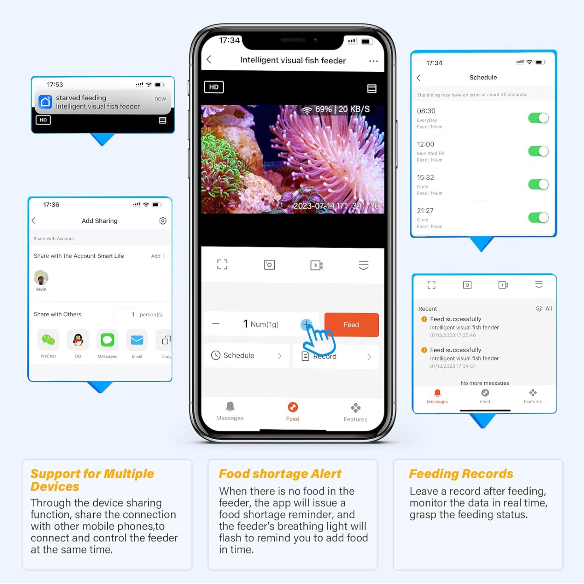 - Offers both manual and automatic feeding options, you can remotely feed your fish with a single feed in the app, and set up automatic timed feeds