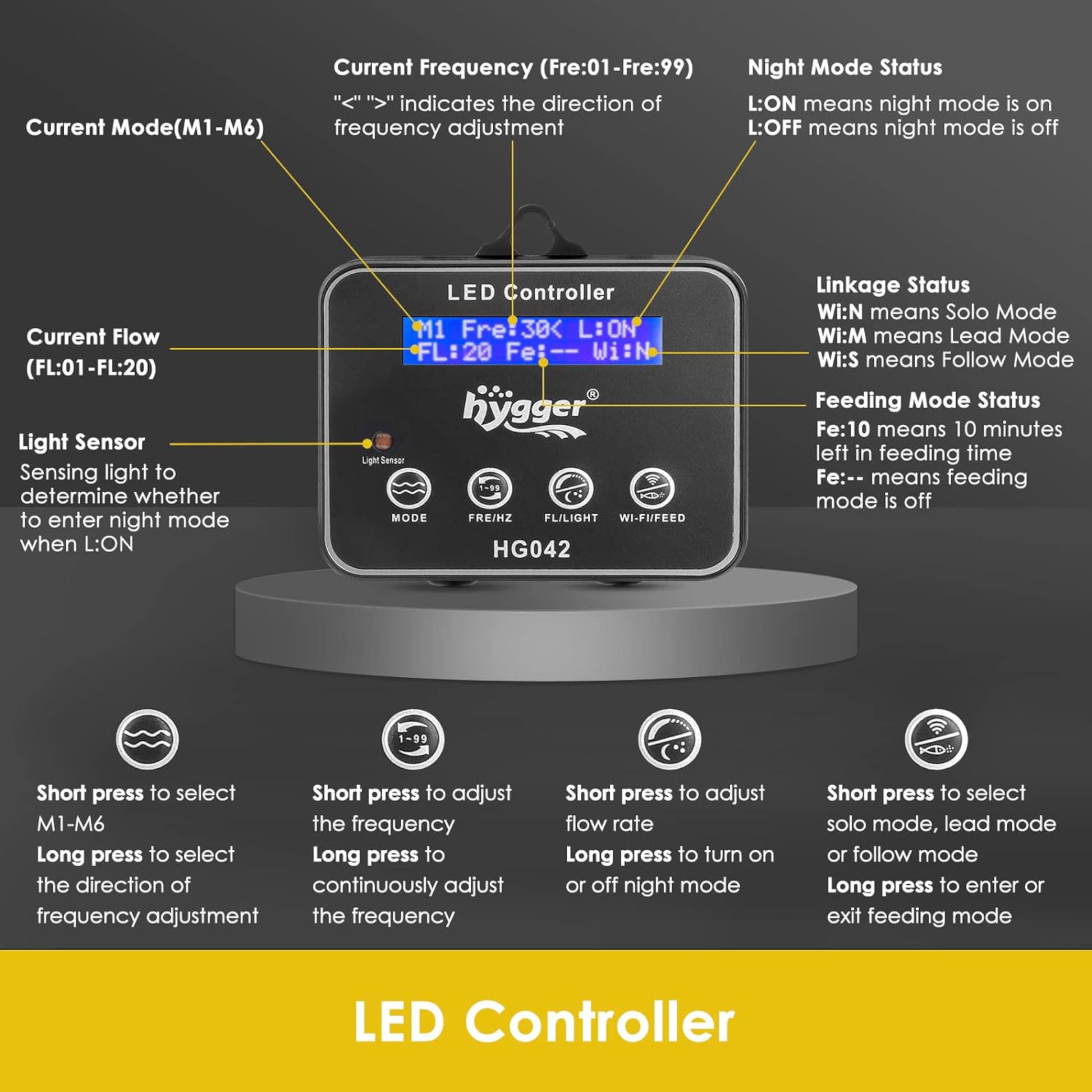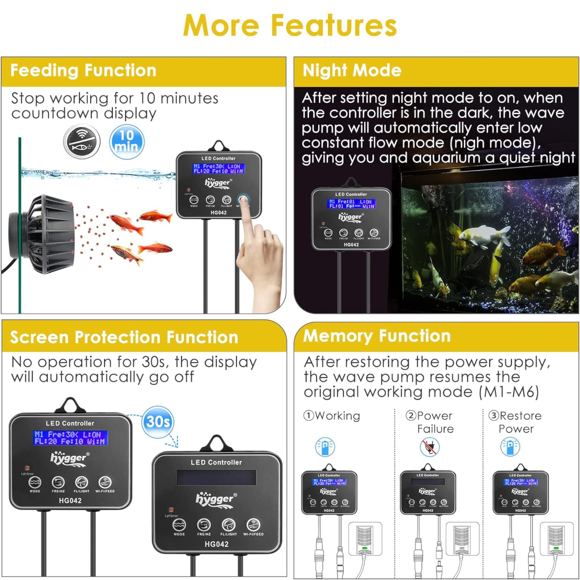 - Wavemaker pump has 6 wave-making modes, 20 levels of wave strength, and 99 levels of frequency, which can be adjusted through the LED controller