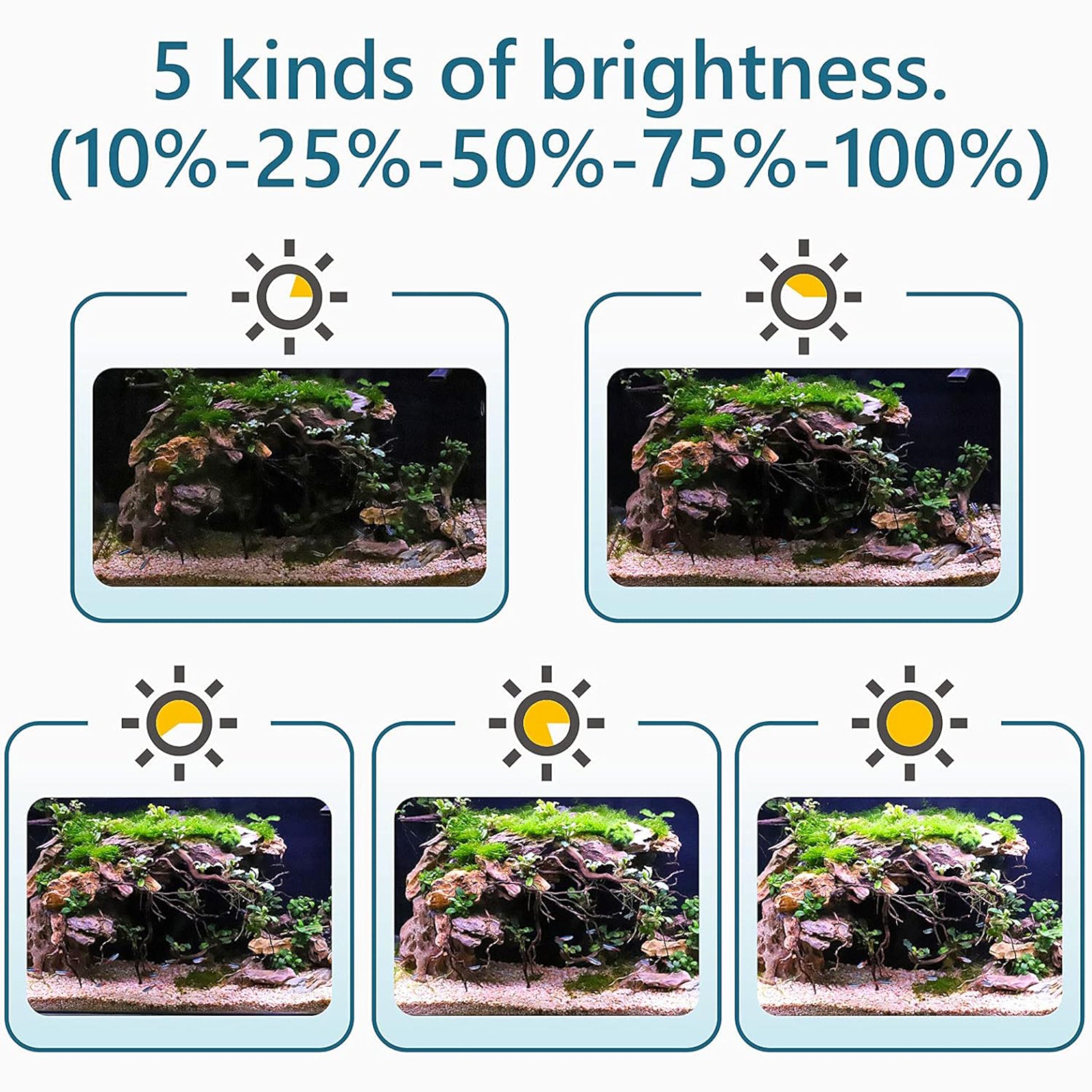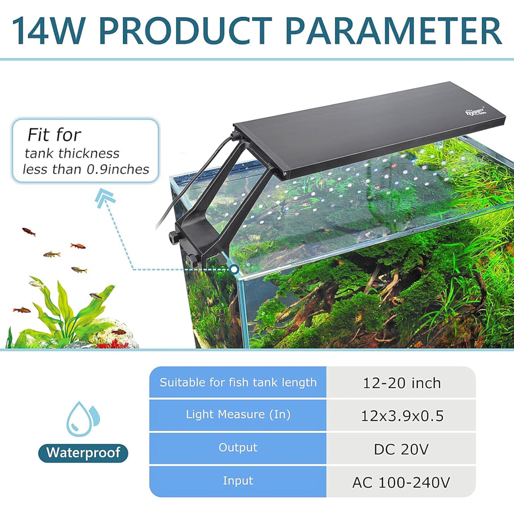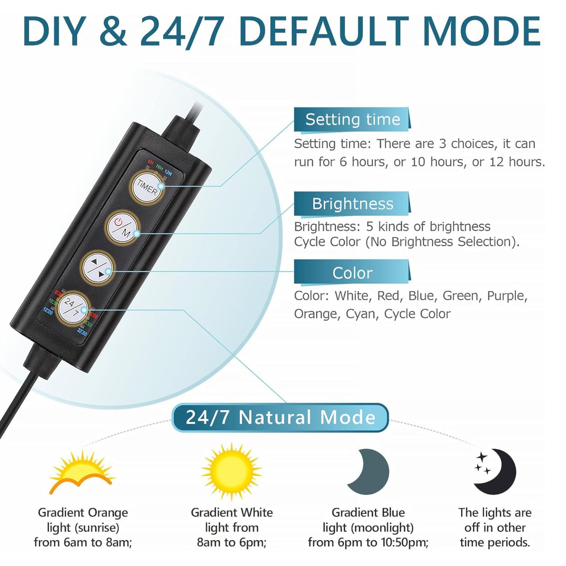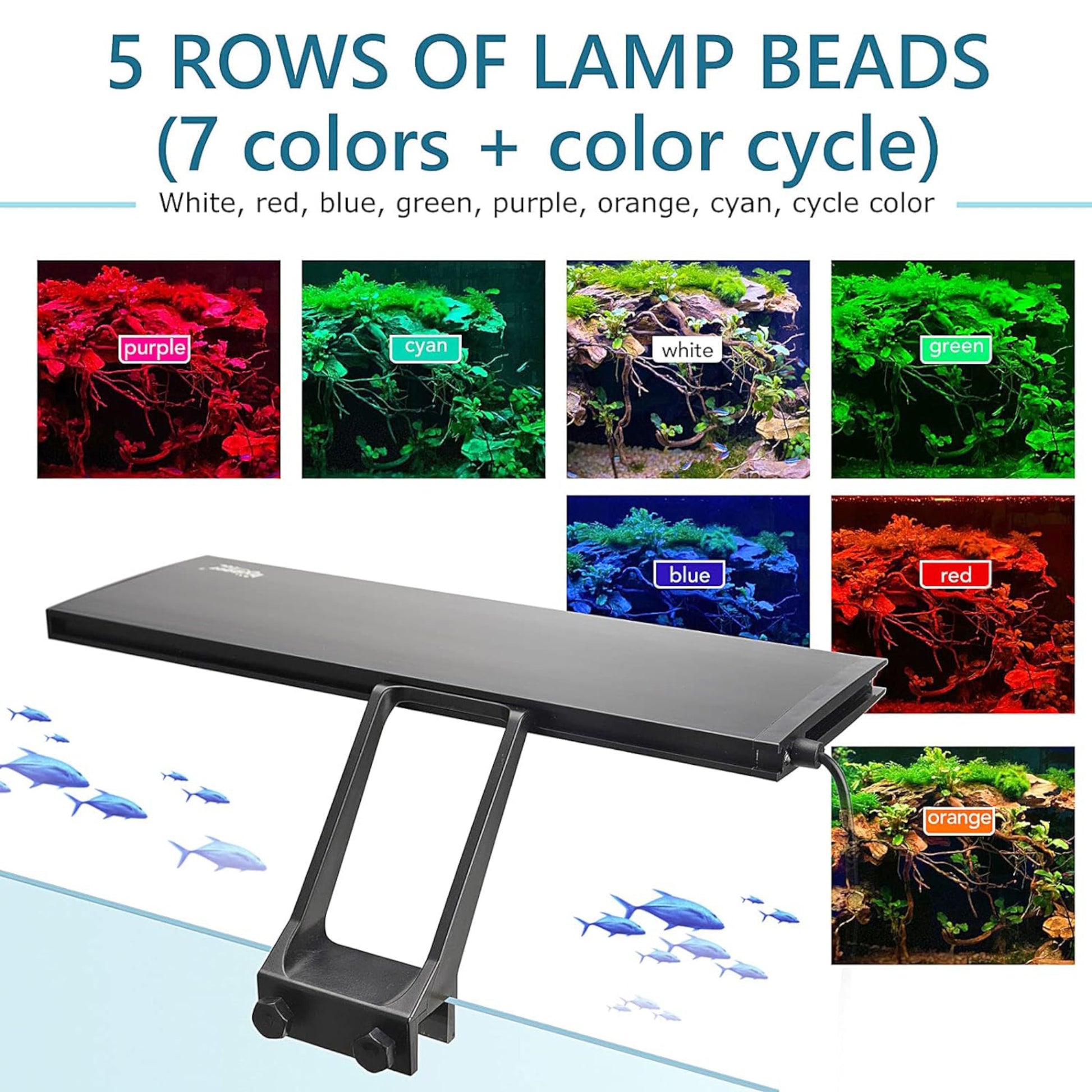 Clip-on 24/7 aquarium light 7 colors with adjustable timer and brightness for fish tank 12″-20″ long.
