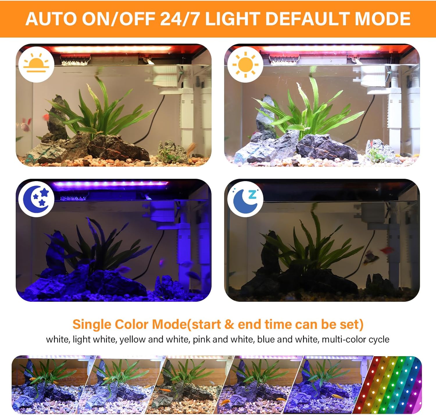 - 24/7 Auto Aquarium Light with 5 Colors: Enjoy vibrant aquarium lighting with the energy-efficient LED in five colors: pure white, soft white, yellow-white, pink-white, and blue-white. Our 24/7 Mode Sunrise automatically adjusts based on local time, simulating sunrise and moonlight, seamlessly transitioning through various light colors and brightness levels throughout the day. Enjoy a sunrise simulation with a gradual shift from yellow to orange light from 6:30 to 6:45 AM. This is followed by a balanced 50% brightness white light from 6:45 to 10:30 AM, a bright 100% white light from 10:30 AM to 4:00 PM, and a softened 50% white light from 4:00 to 6:00 PM. As night approaches, the light transforms to imitate the calm moonlight, with a gentle 50% blue light from 6:00 to 6:20 PM and a dim 20% blue light from 6:20 PM to 10:00 PM. The light automatically turns off during the remaining hours and turns on again the next day, without any need for manual control. It turns off/on automatically with preset settings. Or, choose our Normal Single Mode for simple on/off automation.