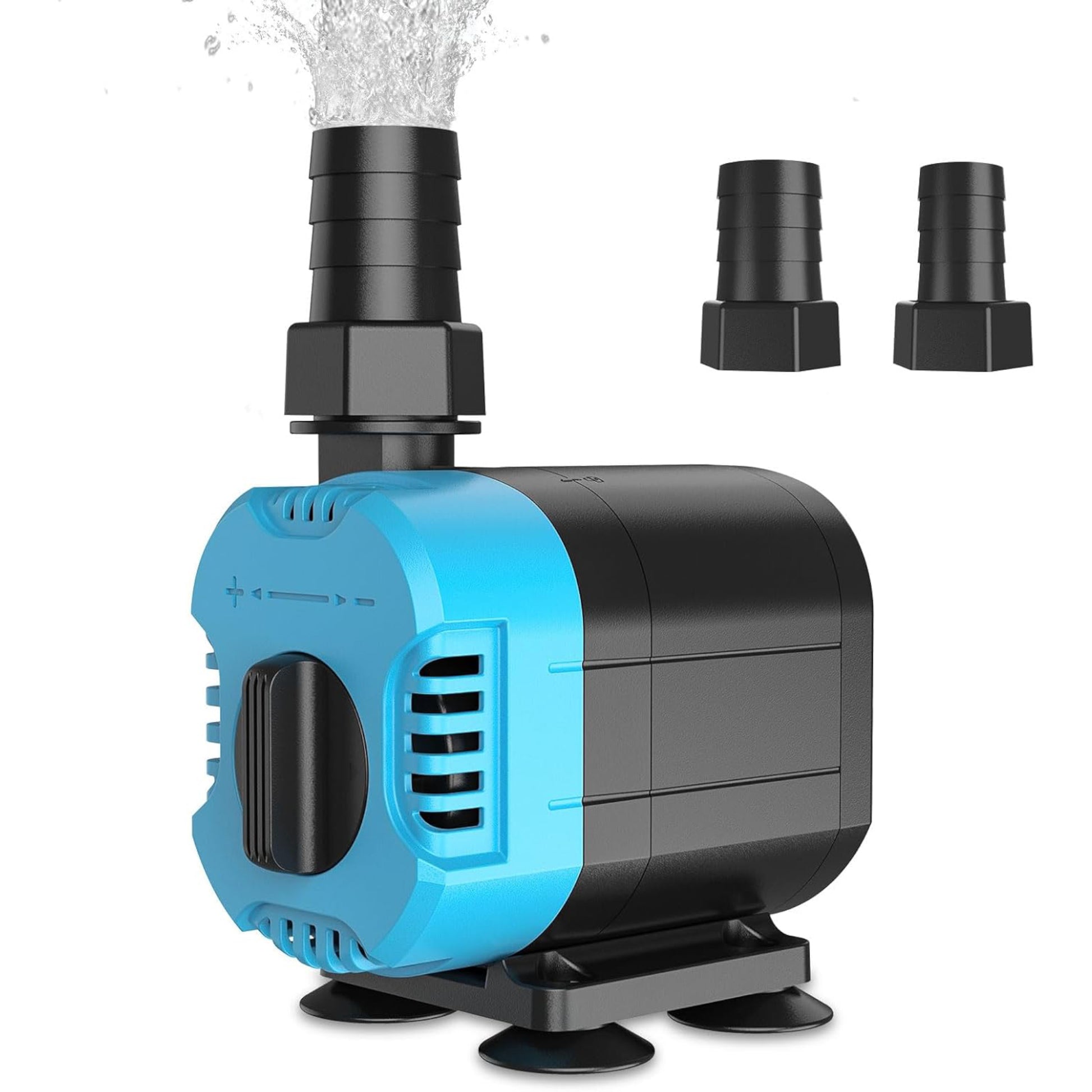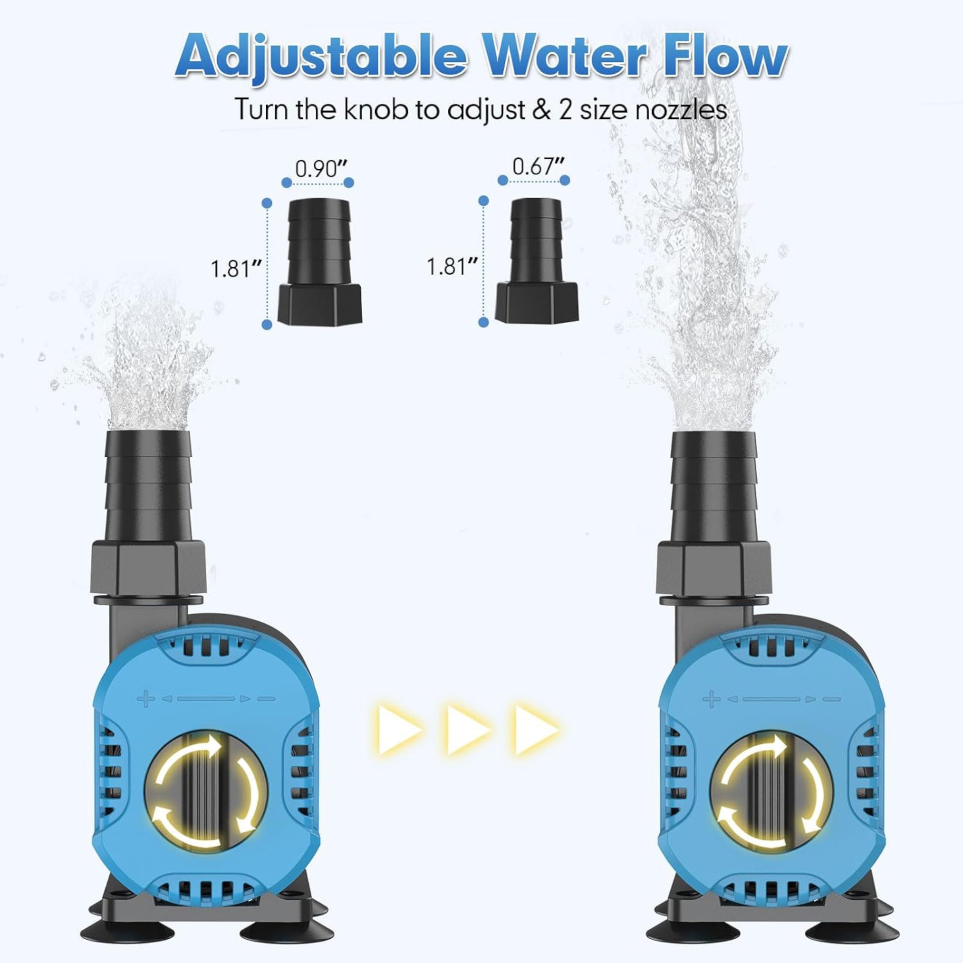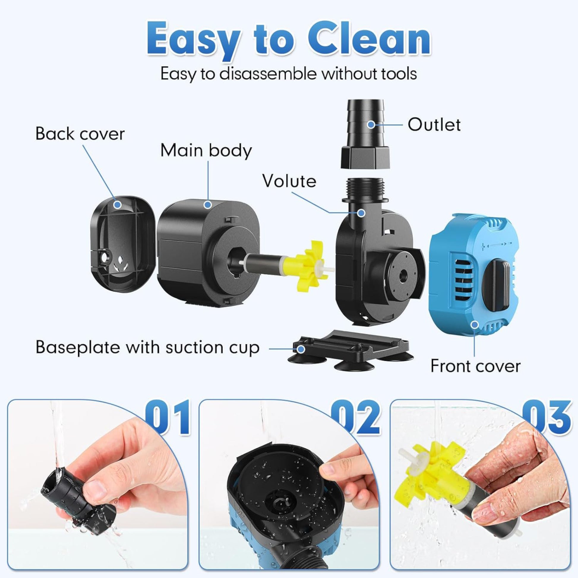 - Quiet & Easy to Clean Water Pump for Pond: The aquarium water pump pushes a perfect amount of water and no noise from it - you can only hear sound of the waterfall. The shockproof rubber feet minimize vibration, and keep the pond water pump in place. You can have it hooked up in the kids bedroom and it will not compromise a good night's sleep. Besides, the submersible pond pump is easy to detach for cleaning, ensuring that maintenance is straightforward