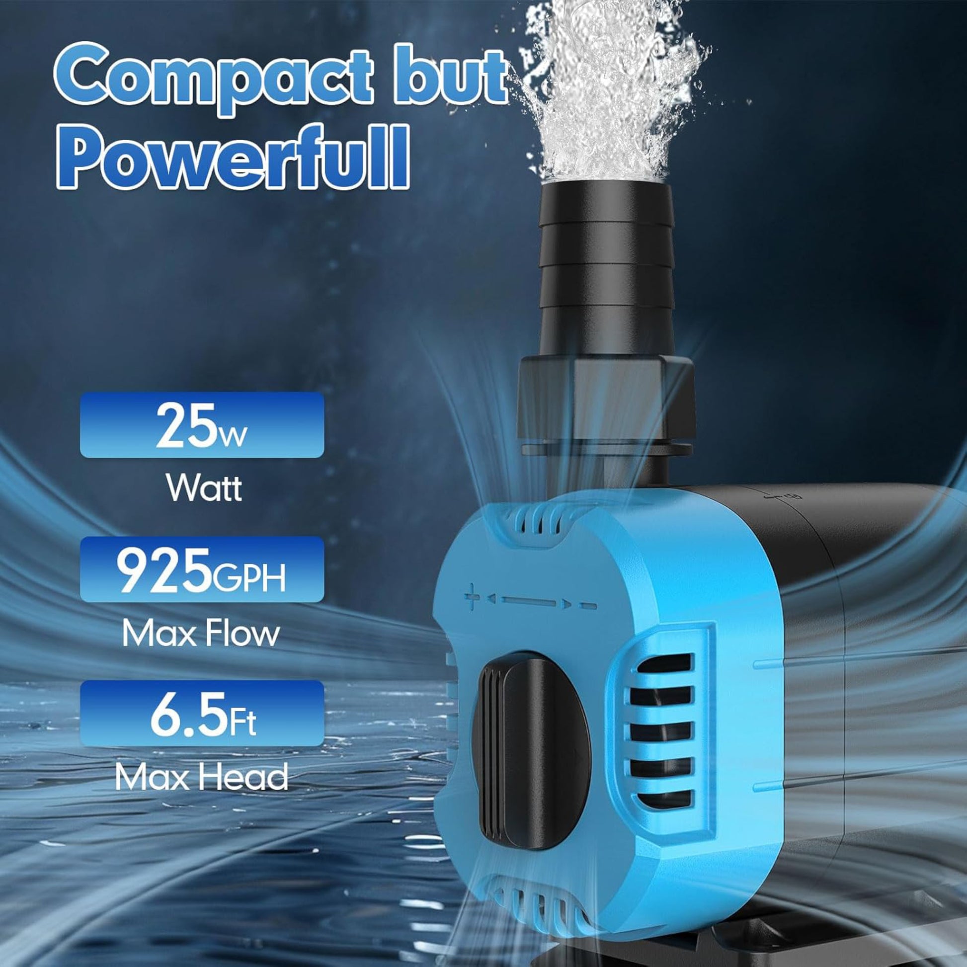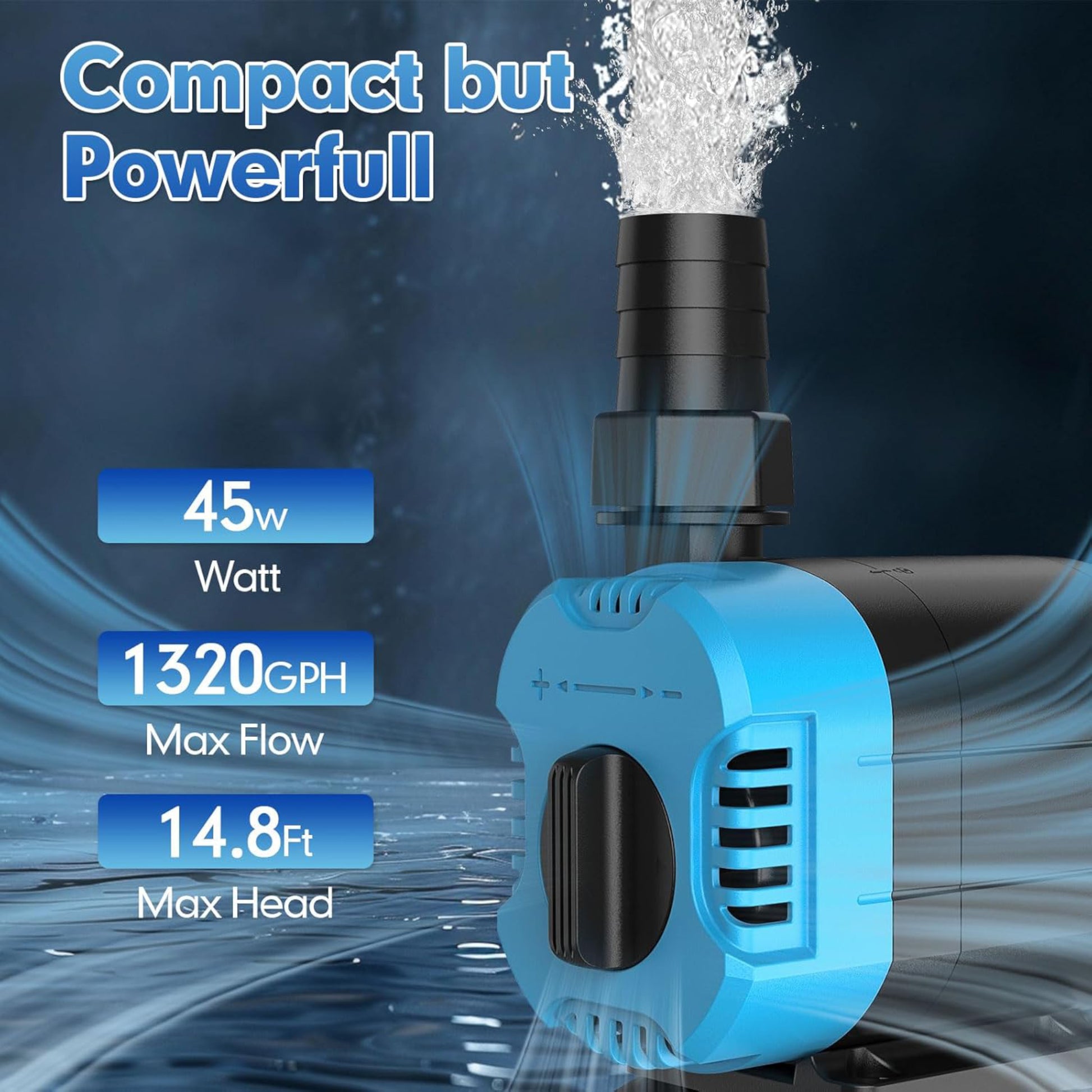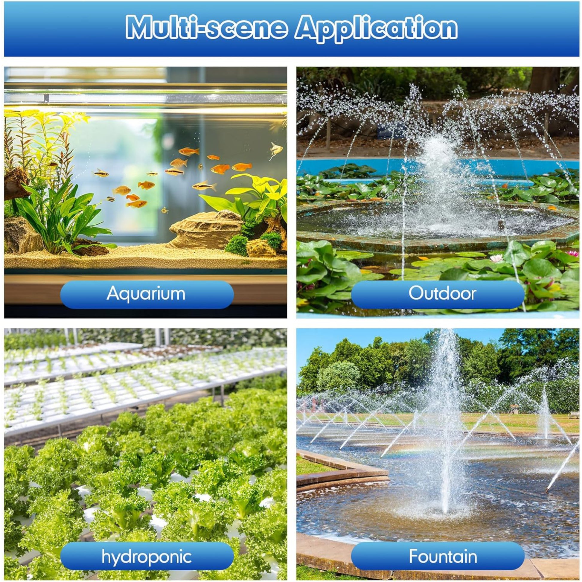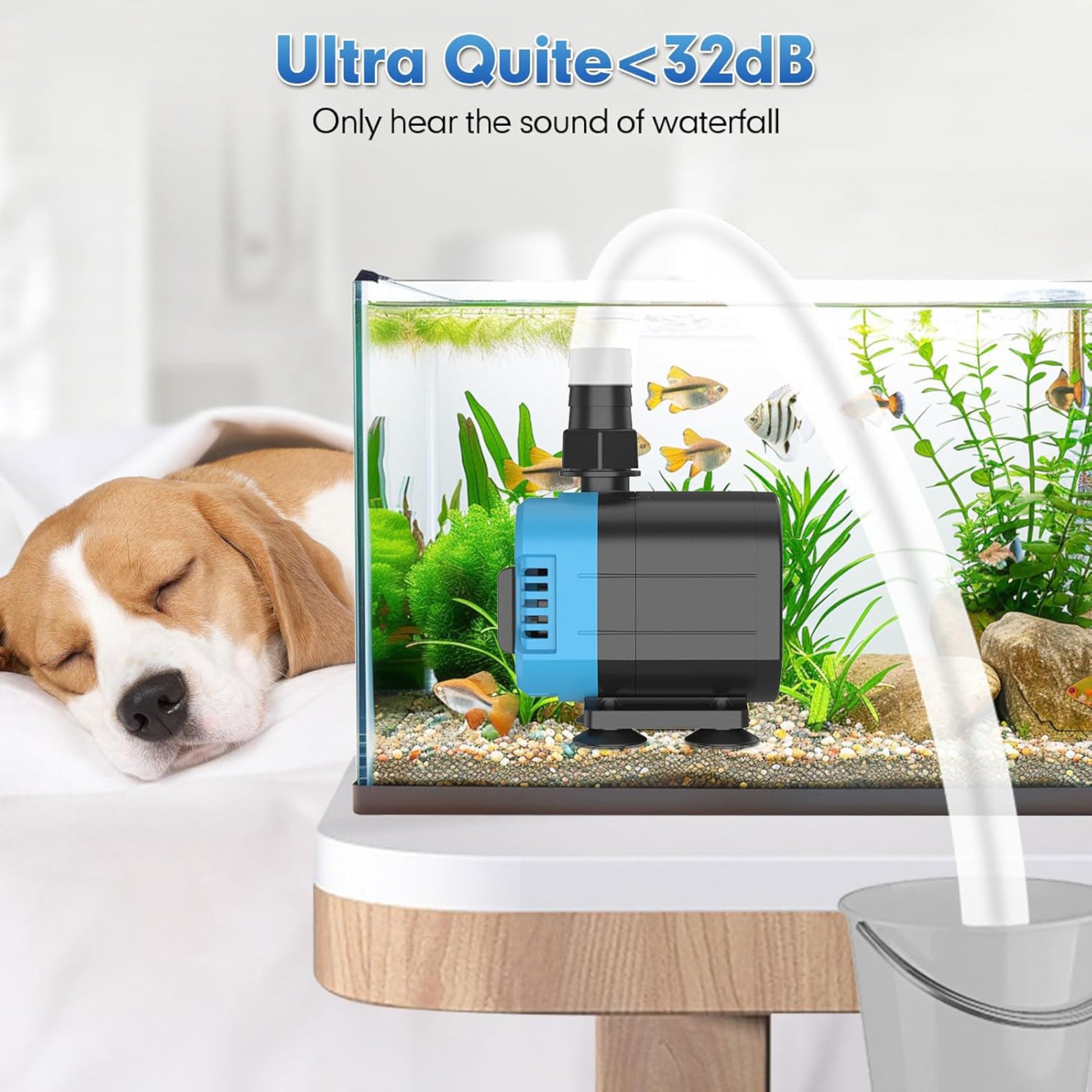 - Quiet & Easy to Clean Water Pump for Pond: The aquarium water pump pushes a perfect amount of water and no noise from it - you can only hear sound of the waterfall. The shockproof rubber feet minimize vibration, and keep the pond water pump in place. You can have it hooked up in the kids bedroom and it will not compromise a good night's sleep. Besides, the submersible pond pump is easy to detach for cleaning, ensuring that maintenance is straightforward