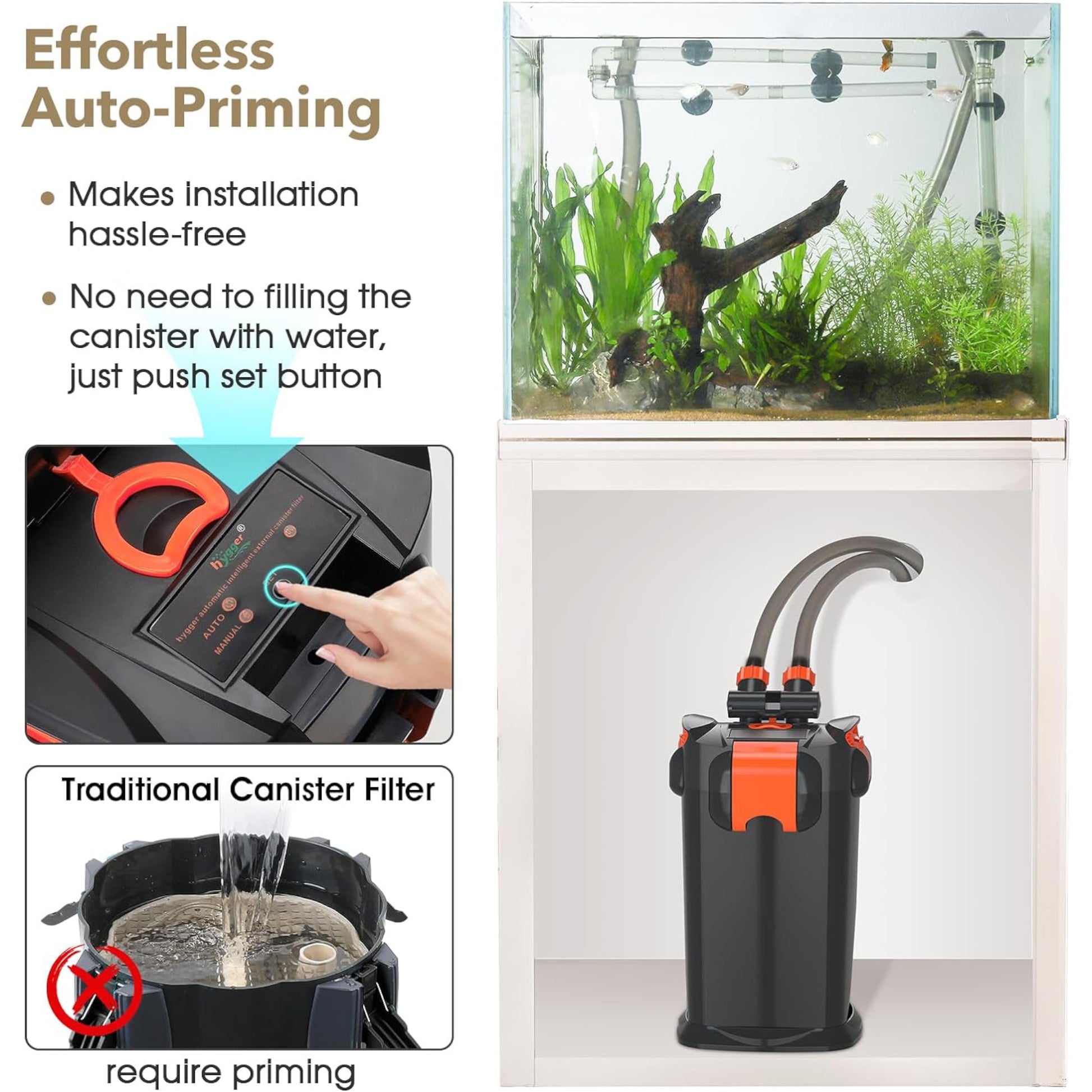 Hygger Self-Priming Canister Filter requires No siphoning, pumping, or priming, just one touch set button, making startup hassle-free and convenient, automatically restarts if power is interrupted and restored.