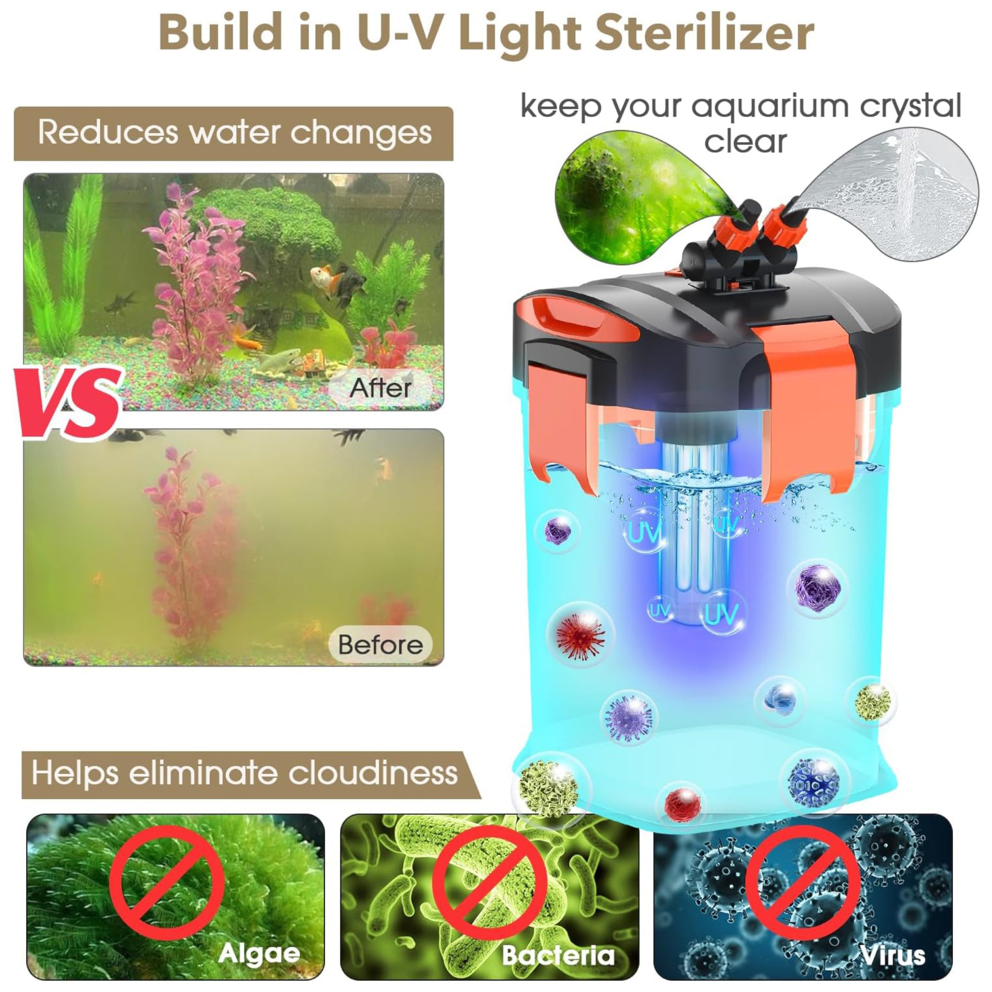 - U-V Light for Crystal Clear Water: The built 7-watt U-V bulb with a protective case helps the aquarium U-V filter effectively take care of algae bloom, eliminating cloudiness, thus reducing water change, keeping the water crystal clear, and ensuring a healthy and clean environment for aquatic pets.